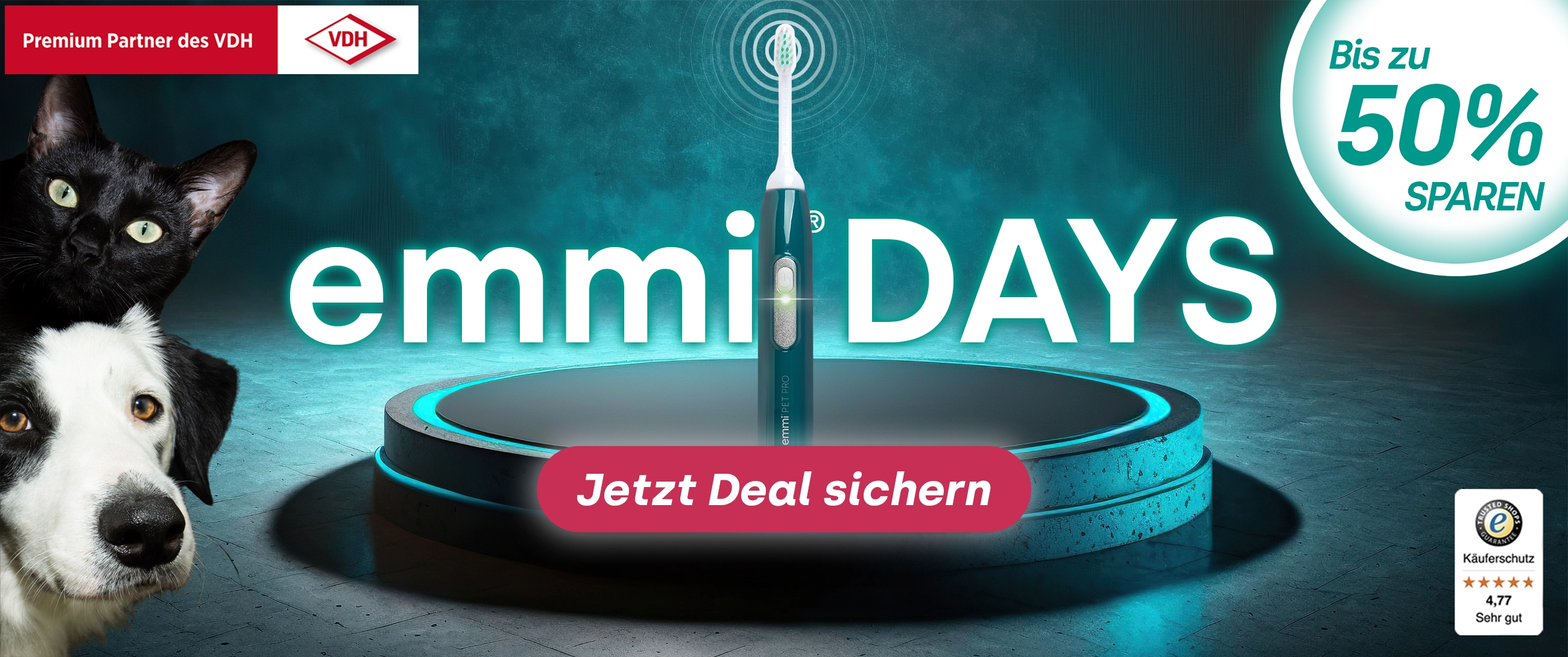 Allerdings ersetzt der Einsatz der Ultraschall-Zahnbürste nicht den Tierarztbesuch. Zahnerkrankungen sollten fachmännisch behandelt werden, damit Dein Hund schmerzfrei ist und der Zahnreinigung mit einer emmi-pet Hundezahnbürste nichts mehr im Weg steht. Wir empfehlen unsere emmi-pet für die Prophylaxe bzw. für die Prävention.