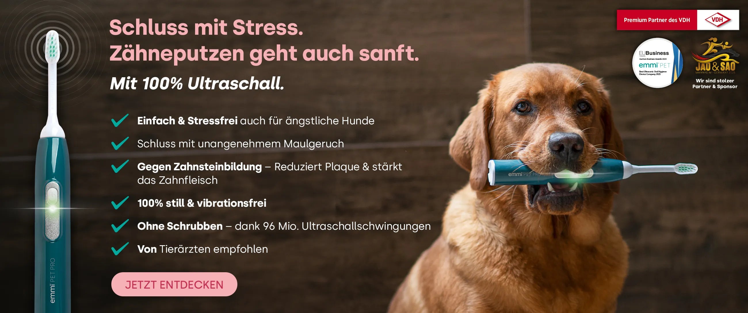 Allerdings ersetzt der Einsatz der Ultraschall-Zahnbürste nicht den Tierarztbesuch. Zahnerkrankungen sollten fachmännisch behandelt werden, damit Dein Hund schmerzfrei ist und der Zahnreinigung mit einer emmi-pet Hundezahnbürste nichts mehr im Weg steht. Wir empfehlen unsere emmi-pet für die Prophylaxe bzw. für die Prävention.