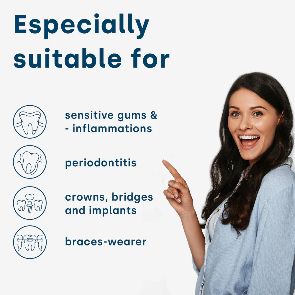 The emmi-dent The Platinum ultrasonic toothbrush is especially recommended for people who need and prefer a particularly thorough cleaning, such as those suffering from gingivitis, periodontitis, or other dental conditions. Using ultrasonic technology, the vibrations penetrate deep into the interdental spaces and gums to clean even in hard-to-reach areas, effectively preventing cavities, plaque, and gingivitis.