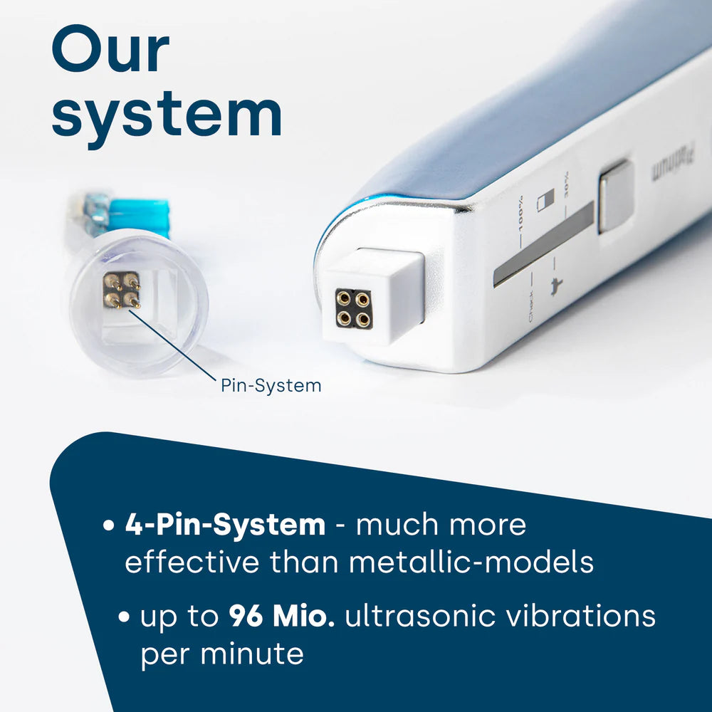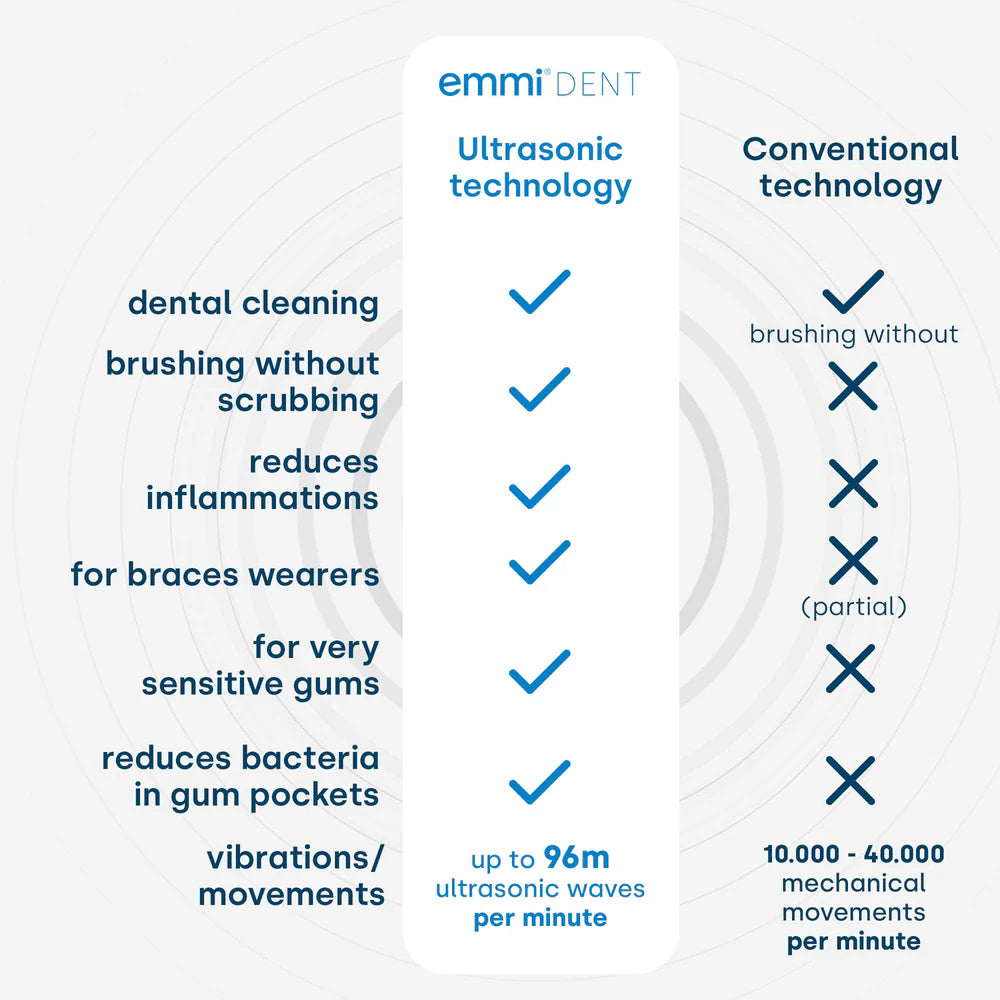 Compared to conventional electric toothbrushes, the emmi-dent Platinum Ultrasonic Toothbrush provides deep and effective cleaning by using ultrasonic waves to reduce bacteria and plaque.