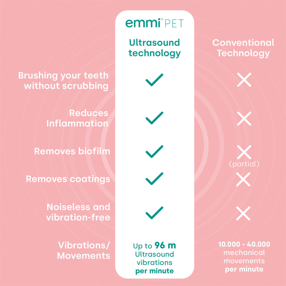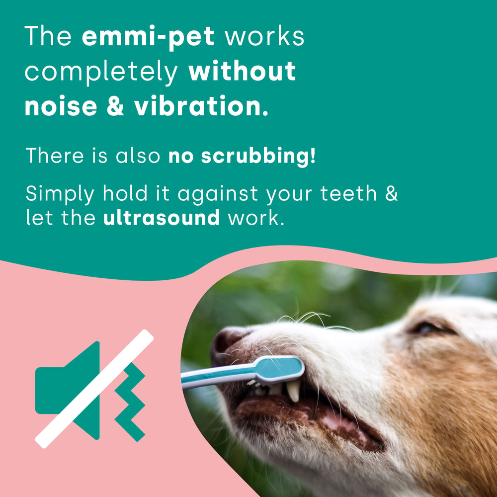 The unique ultrasonic technology of the emmi-pet 2.0, with up to 96 million ultrasonic vibrations per minute, offers a significant advantage over conventional tooth cleaning methods. This technological innovation makes it possible to gently reduce plaque and prevent tartar, while protecting the gums and sensitive areas in the dog's mouth. The ultrasonic waves are inaudible to the dog at this frequency, which makes the emmi-pet 2.0 particularly suitable for animals.