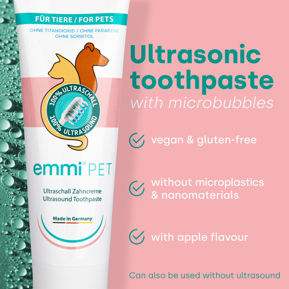 Ideal brush heads for small dogs as well as for large dogs. Specially designed to provide optimal care for every size and breed. The emmi-pet PRO basic set contains two specially developed brush heads (1x large, 1x small) that are suitable for both small and large dogs. With the emmi-pet ultrasonic toothpaste, which is free of titanium dioxide and parabens, dental care becomes even safer and gentler.