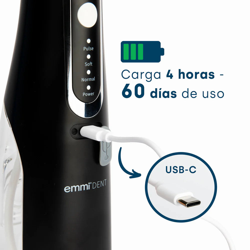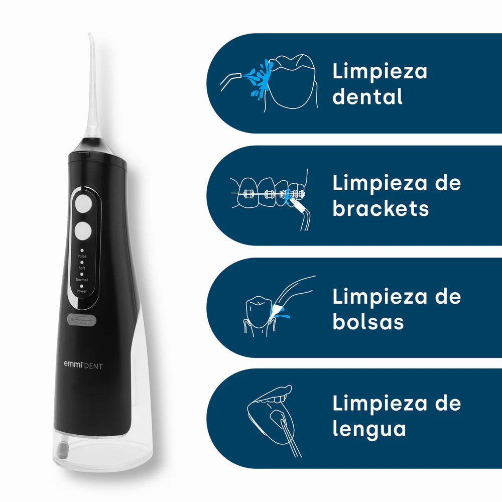 Para limpiar a fondo y de forma eficaz los espacios entre los dientes, a menudo no basta con cepillarse los dientes únicamente. El emmi-dent Desarrollado irrigador bucal. Para protegerse contra problemas de encías, donde los cepillos de dientes convencionales no pueden llegar. En comparación con el hilo dental, emmi-dent Irrigador bucal para una limpieza perfecta incluso con dientes muy juntos o espacios interdentales de difícil acceso. El dispositivo tiene cuatro modos: pulso, suave, normal y fuerte. Con los cuatro accesorios de boquilla incluidos, tendrá la boquilla adecuada para cada tarea de limpieza. Recomendamos reemplazar las boquillas cada 3 meses.