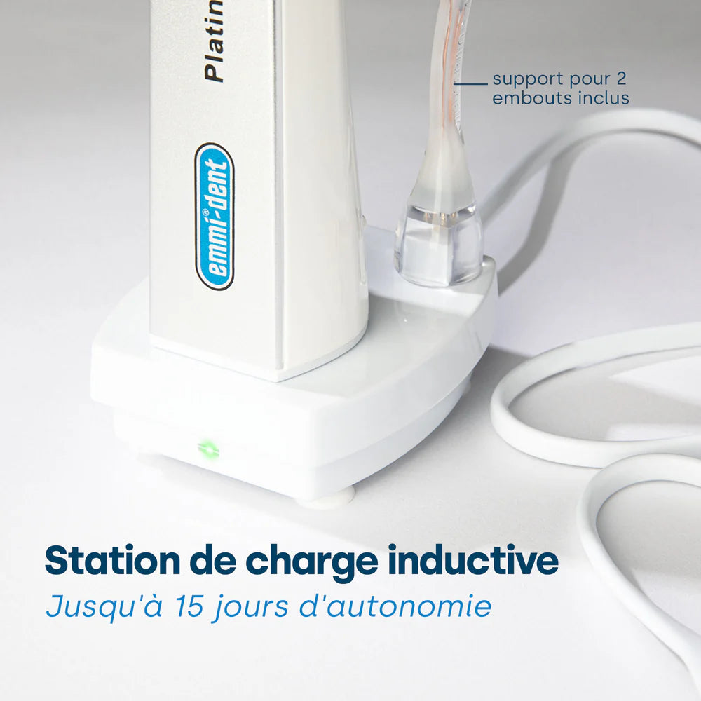 Grâce à la technologie à ultrasons sans abrasion, l'emmi-dent PlatinumCAM est particulièrement adapté aux personnes ayant des gencives sensibles, des implants, des appareils dentaires ou des maladies dentaires telles que la parodontite. Les vibrations douces nettoient en douceur sans irriter les dents ni les gencives. Cela gardera vos dents en bonne santé sans endommager l'émail.
