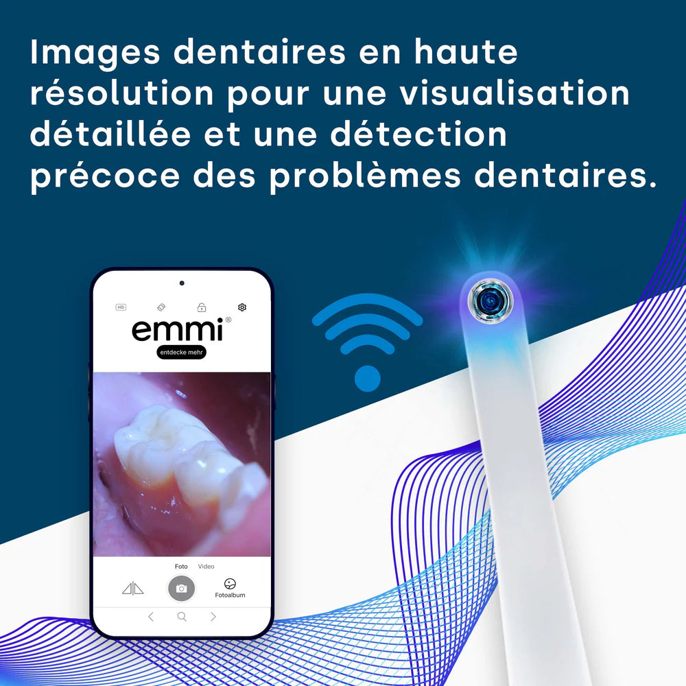 L'emmi-dent PlatinumCAM apporte une innovation révolutionnaire dans les soins dentaires avec sa caméra dentaire intégrée. Cette caméra permet d'inspecter la cavité buccale en temps réel. En vous connectant à l'application emmi sur votre smartphone ou votre tablette, vous pouvez rendre visibles les zones difficiles d'accès et vous assurer que votre bouche est propre jusqu'au dernier recoin.