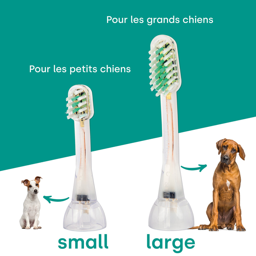For consistently effective dental care for your dog, regular replacement of the attachment brush is particularly important. With each use, the fine bristles of the ultrasonic dog toothbrush wear down slightly and can lose cleaning power over time. Hygienic reasons also play an important role, as residue and bacteria can accumulate on the brush head with daily use.