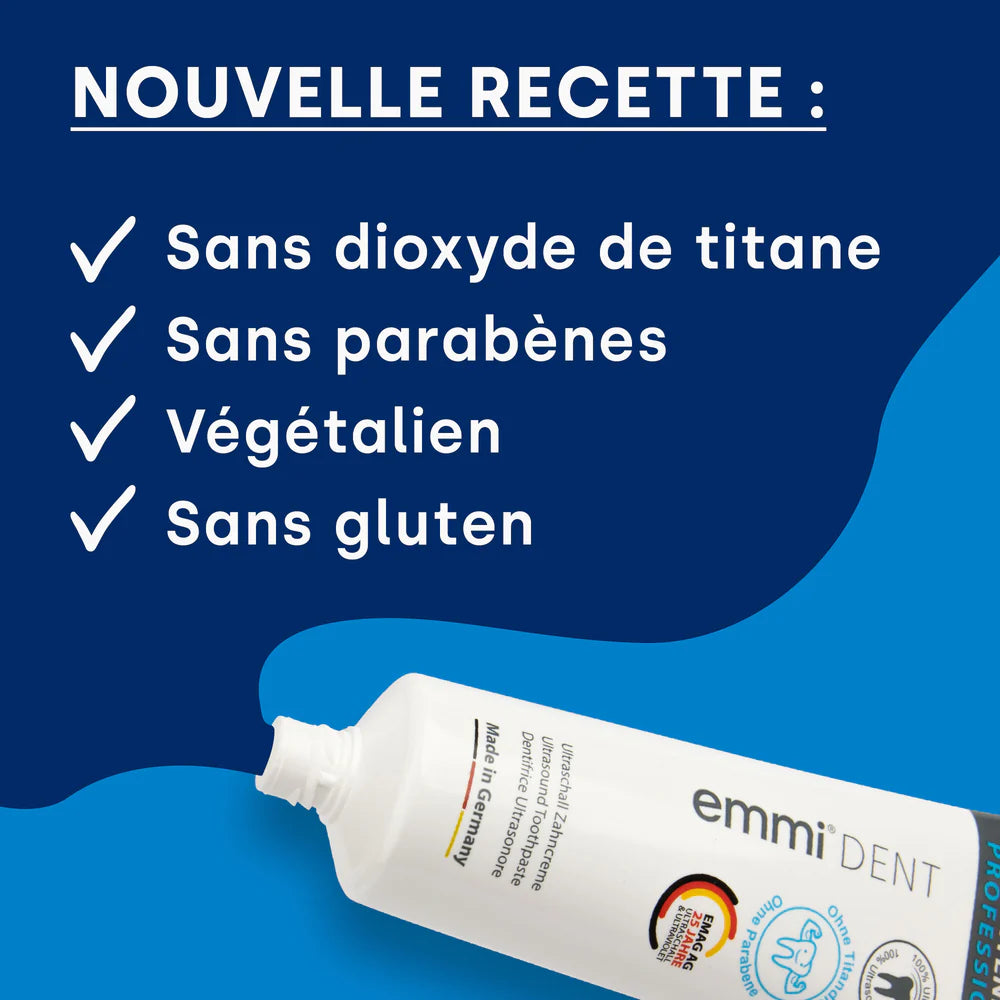 Découvrez le monde amélioré de emmi-dent Dentifrice blanchissant–désormais sans dioxyde de titane et sans parabène ! Découvrez le même effet blanchissant puissant, mais avec une formule encore plus naturelle. L'absence de dioxyde de titane rend notre dentifrice doux et délicat, parfait pour des dents blanches étincelantes sans compromis. Profitez du meilleur des soins dentaires naturels et d'un sourire radieux !