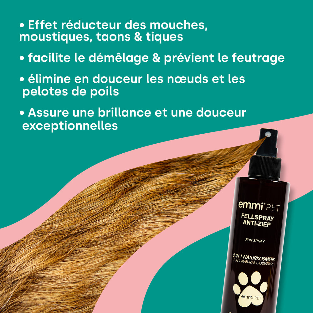 - Fellspray: auf trockenes oder leicht feuchtes Fell sprühen – nicht auswaschen.