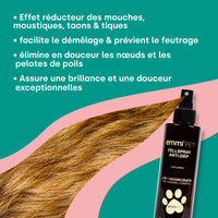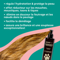 Mit dem Fellspray Anti-Ziep Natur gehört ziependes Bürsten der Vergangenheit an. Die 100 % natürliche Formel erleichtert das Durchkämmen, spendet Feuchtigkeit, stärkt die Haarstruktur und schützt vor äußeren Einflüssen – für ein seidig weiches, geschmeidiges Fell.