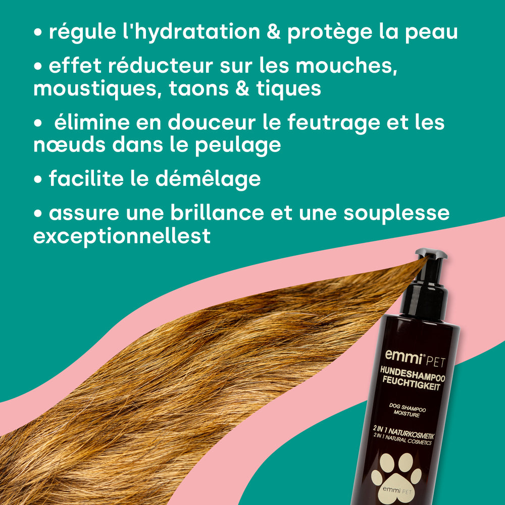 Das emmi-PET Hundeshampoo Feuchtigkeit Natur reinigt Haut und Fell gründlich, ohne auszutrocknen. Die pflanzliche Formel mit feuchtigkeitsspendenden Extrakten aus Aloe Vera, Kräutern, Sanddornöl und Zitroneneukalyptus unterstützt die natürliche Hautschutzbarriere, sorgt für einen gesunden Glanz und macht das Fell leichter kämmbar – ideal auch für sensible Hunde und Welpen ab der 10. Woche.