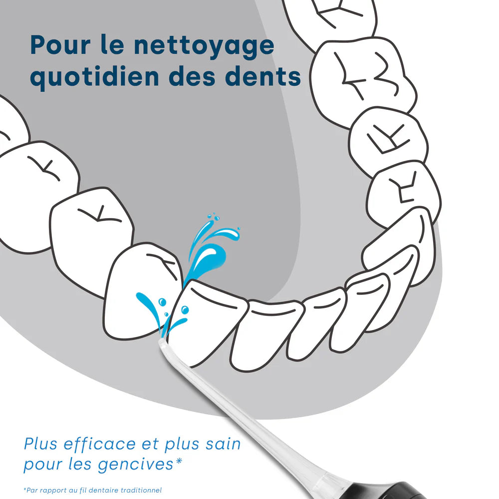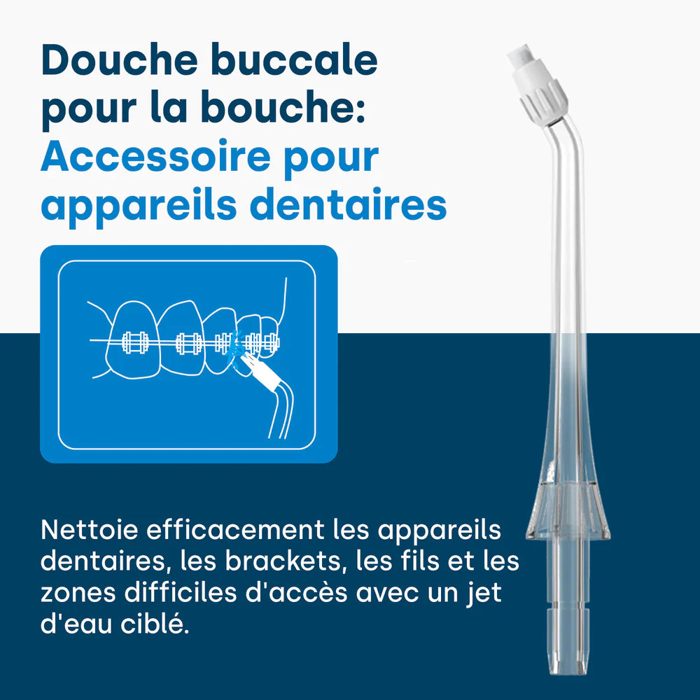 L'irrigateur buccal est particulièrement utile pour les personnes portant un appareil dentaire, un pont ou des implants. Il atteint les zones difficiles d'accès et élimine les dépôts autour des appareils orthodontiques et des implants.
