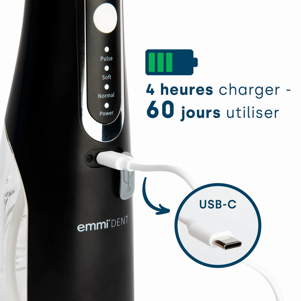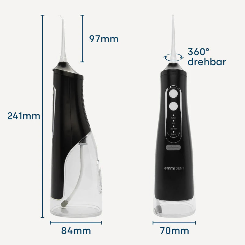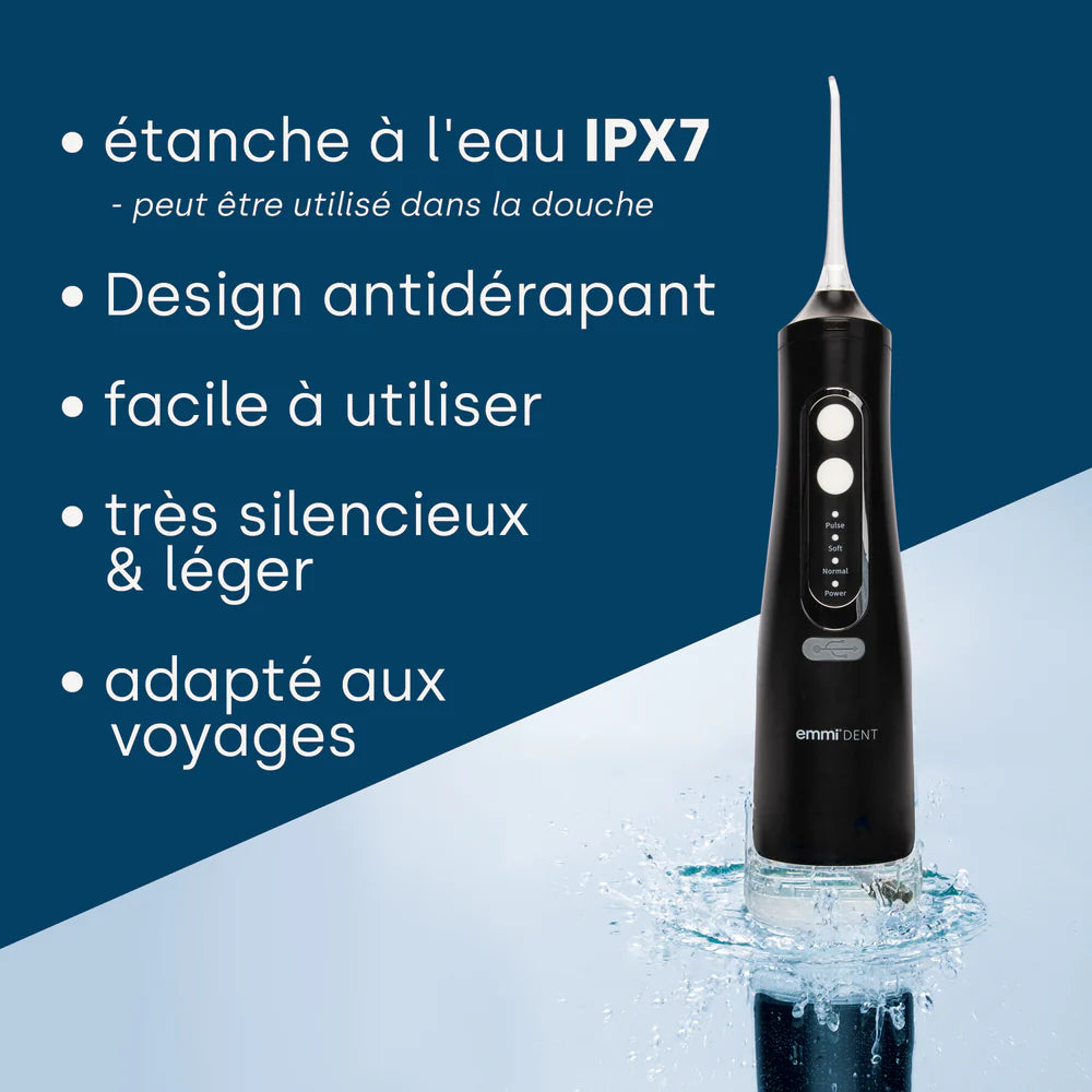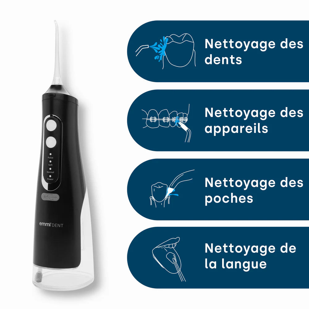 Pour nettoyer soigneusement et efficacement les espaces entre vos dents, le brossage des dents seul n'est souvent pas suffisant. Le emmi-dent Développement d'un irrigateur buccal. Pour protéger contre les problèmes de gencives–là où les brosses à dents conventionnelles ne peuvent pas atteindre. Par rapport au fil dentaire, emmi-dent Irrigateur buccal pour un nettoyage parfait même en cas de dents rapprochées ou d'espaces interdentaires difficiles à atteindre. L'appareil dispose de quatre modes : pulsé, doux, normal et fort. Avec les quatre embouts de buse inclus, vous disposez de la buse adaptée à chaque tâche de nettoyage. Nous recommandons de remplacer les buses tous les 3 mois.