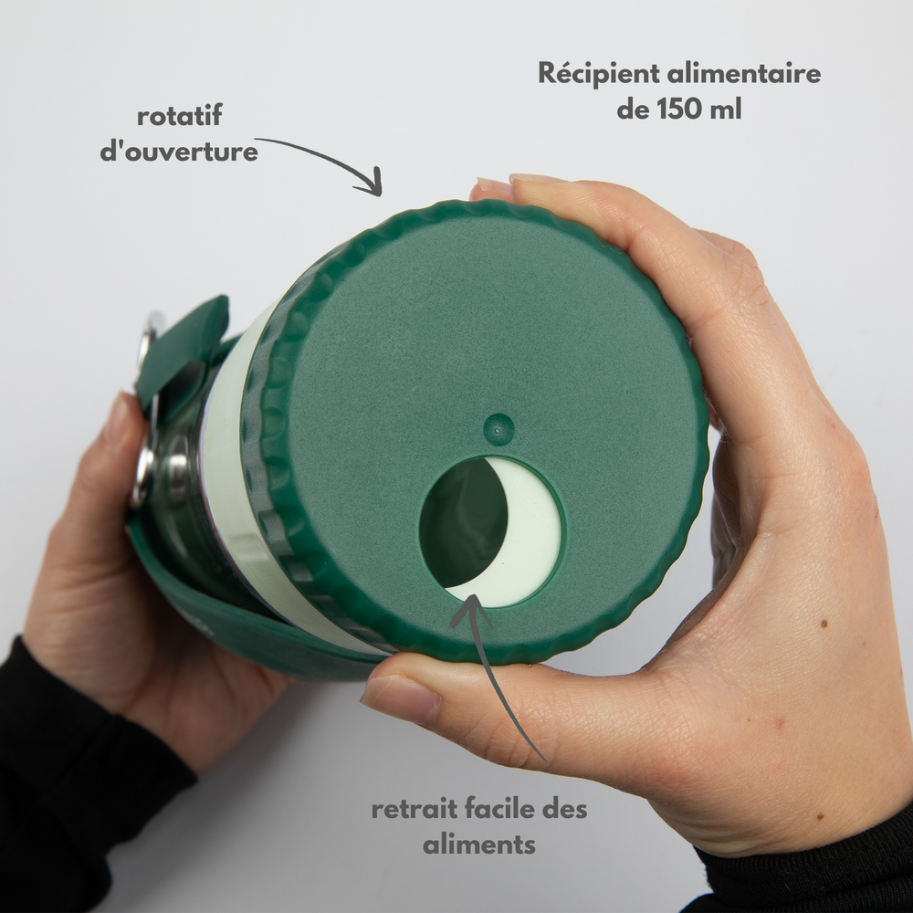 • Contenant à collation intégré : 150 ml supplémentaires pour la nourriture ou les collations-parfait pour les petites récompenses en déplacement.