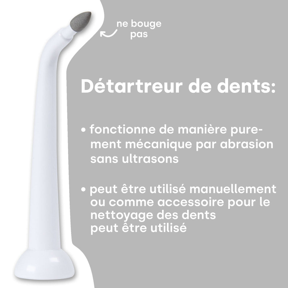 Le détartrant emmi peut être utilisé manuellement ou comme accessoire pour le nettoyage des dents. Il fonctionne de manière purement mécanique par abrasion sans ultrasons.