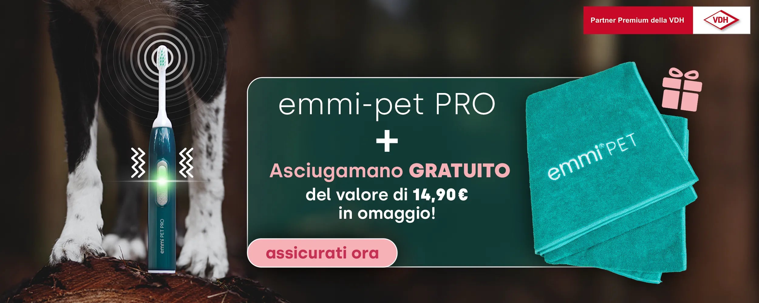 Una flora orale sana può addirittura prolungare la vita del vostro amico a quattro zampe. Con la giusta routine di igiene dentale e lo spazzolino ultrasonico per animali emmi-pet, puoi prevenire efficacemente tartaro, scolorimento dei denti e infiammazioni gengivali.