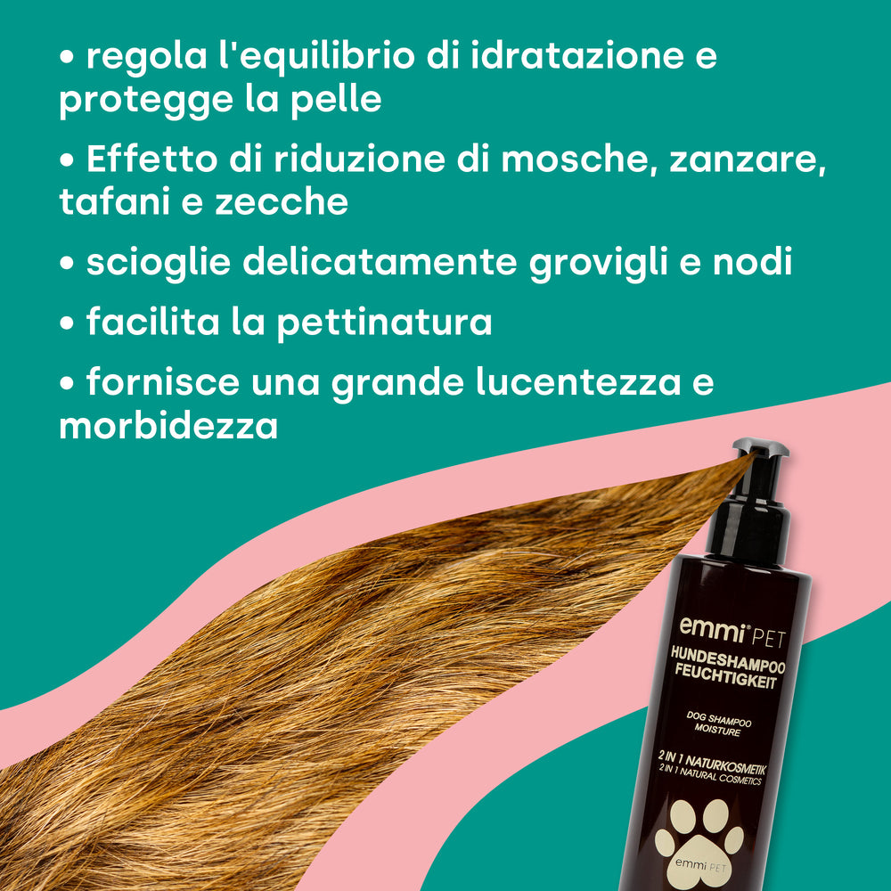 Lo shampoo naturale per cani Emmi-PET Moisture deterge a fondo pelle e pelo senza seccarli. La formula a base vegetale con estratti idratanti di aloe vera, erbe aromatiche, olio di olivello spinoso ed eucalipto limone supporta la naturale barriera protettiva della pelle, dona una sana lucentezza e rende il pelo più facile da pettinare: ideale per cani sensibili e cuccioli a partire dalle 10 settimane di età.