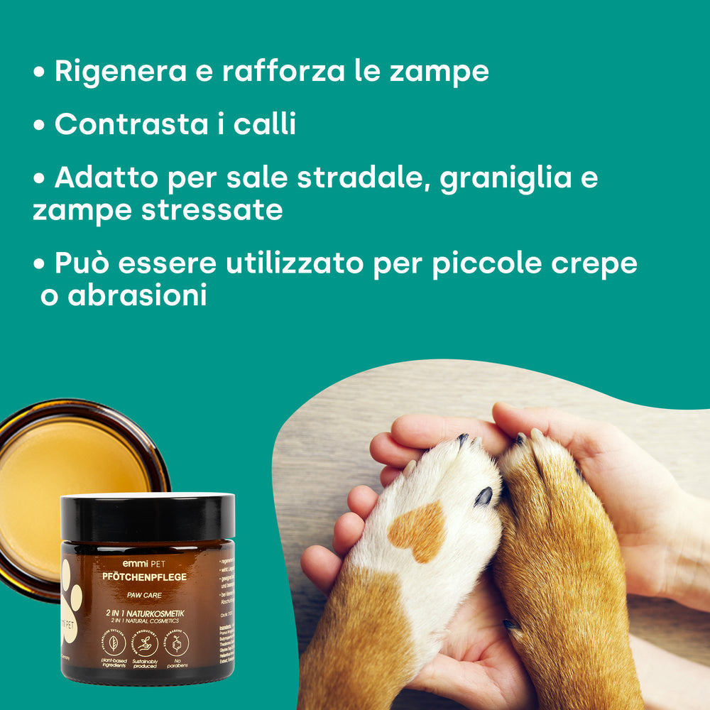 • Cura delle zampe: applicare sulle zampe pulite e asciutte e massaggiare delicatamente.