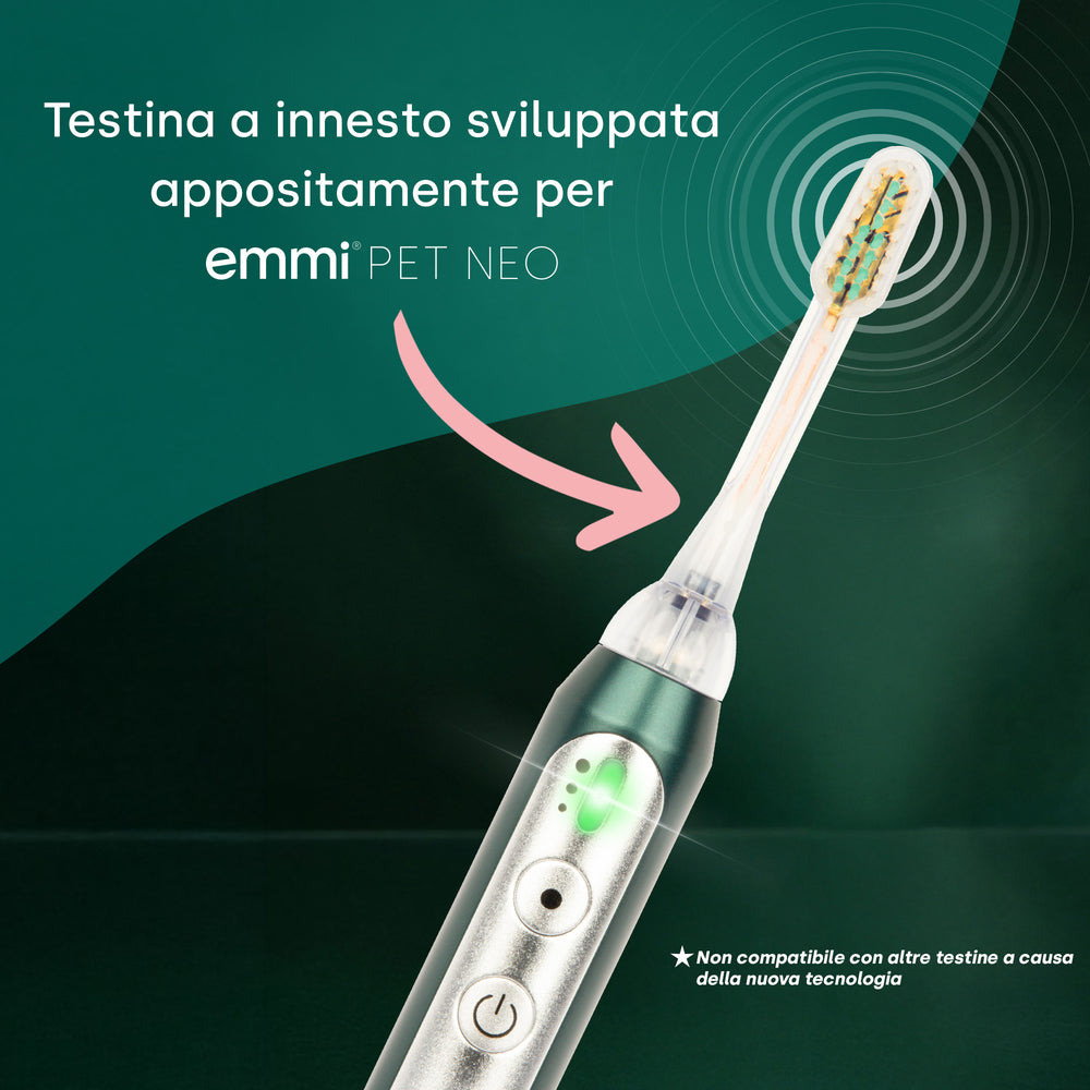 Affinché la pulizia dei denti del tuo cane continui a funzionare in modo accurato e delicato, ti consigliamo di sostituire la testina del tuo spazzolino a ultrasuoni emmi-pet al più tardi ogni tre mesi. Un cambio regolare della testina assicura che l'energia ultrasonica venga trasmessa in modo ottimale e che la placca possa essere ridotta in modo affidabile, per un'igiene orale costantemente sana e un sorriso fresco del cane.