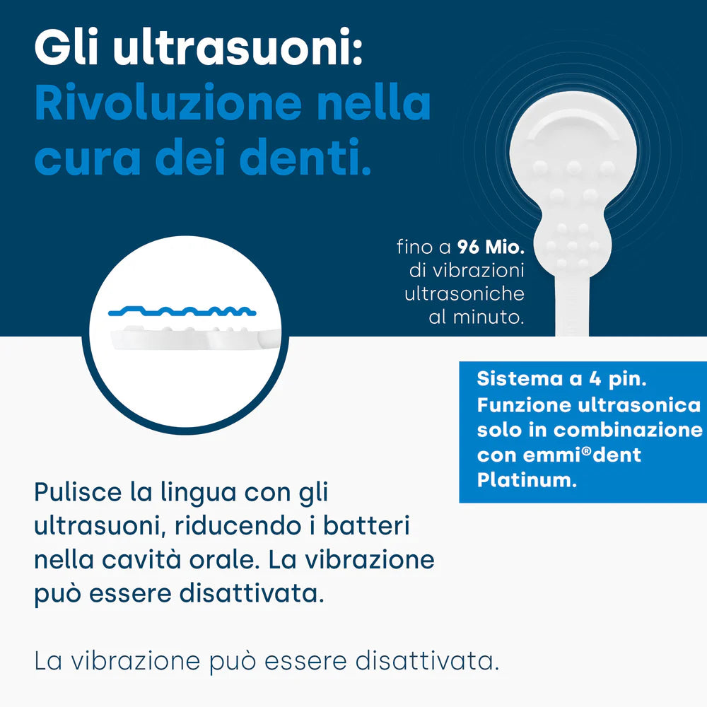 Con l'aiuto del emmi-dent I puliscilingua possono ridurre i batteri attraverso gli ultrasuoni. Per utilizzarlo, posizionare il puliscilingua sulla emmi-dent Spazzolino da denti allegato.