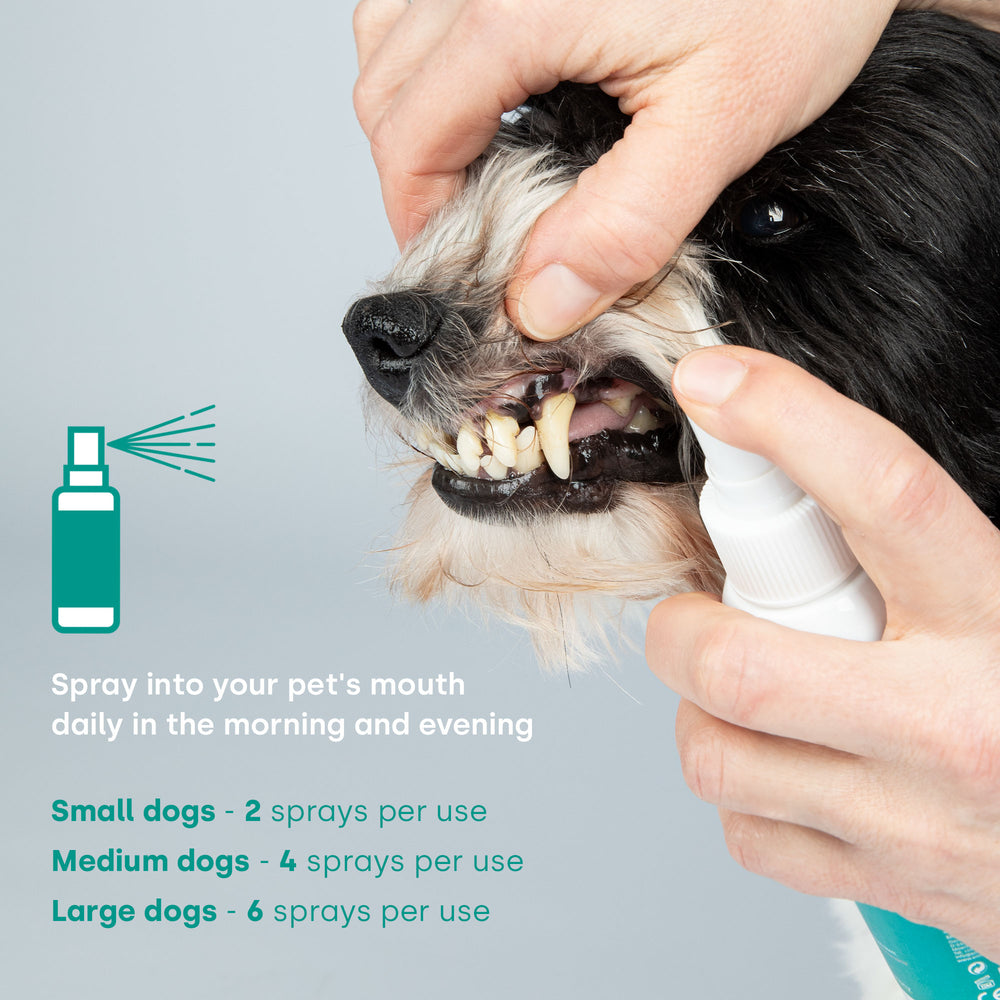 Per i cani di piccola taglia consigliamo 2 spruzzi direttamente in bocca o in alternativa sul cibo. Per i cani di taglia media sono consigliate 4 spruzzate al giorno, mentre per i cani di taglia grande sono consigliate 6 spruzzate al giorno, per supportare al meglio la loro salute dentale. Lo spray per cani e gatti riduce in modo efficace il tartaro e aiuta a prevenire ulteriori problemi dentali. Grazie agli ingredienti naturali, l'igiene orale del tuo cane o gatto diventerà un gioco da ragazzi.