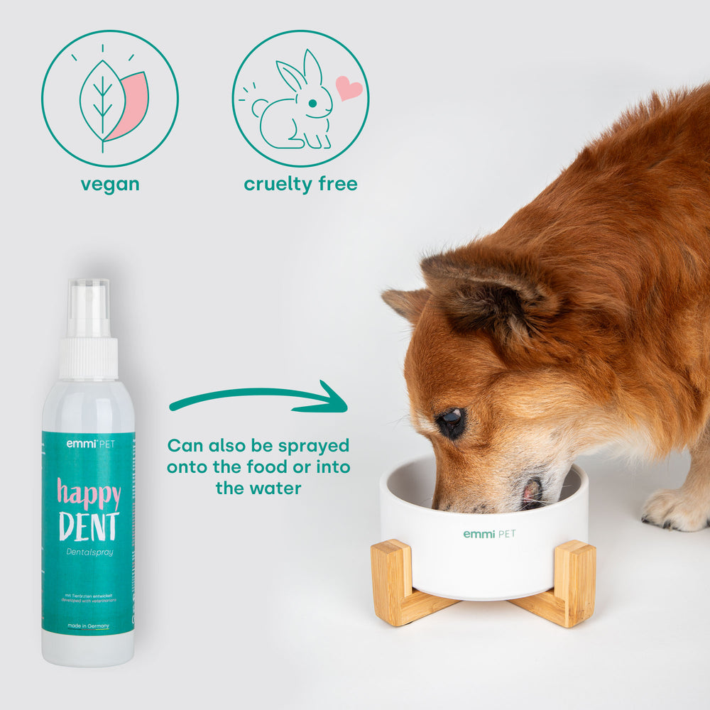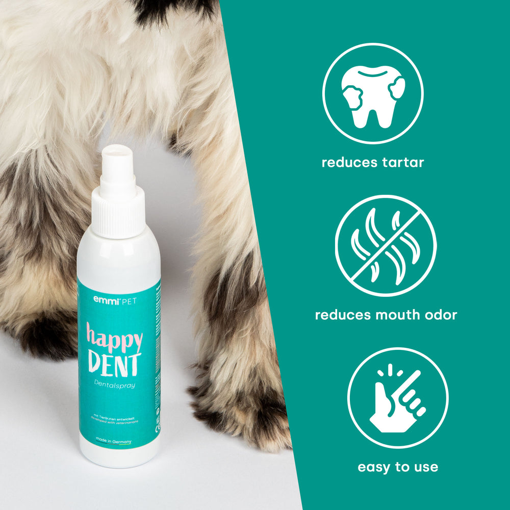Lo spray dentale Happy DENT è la soluzione ideale per un alito fresco e previene efficacemente la formazione del tartaro. Facile da usare, combatte i batteri e la placca che possono causare carie e problemi gengivali. In ufficio, in auto o in viaggio, con lo spray dentale Happy DENT hai sempre una soluzione rapida e pratica per l'igiene orale del tuo amico a quattro zampe.