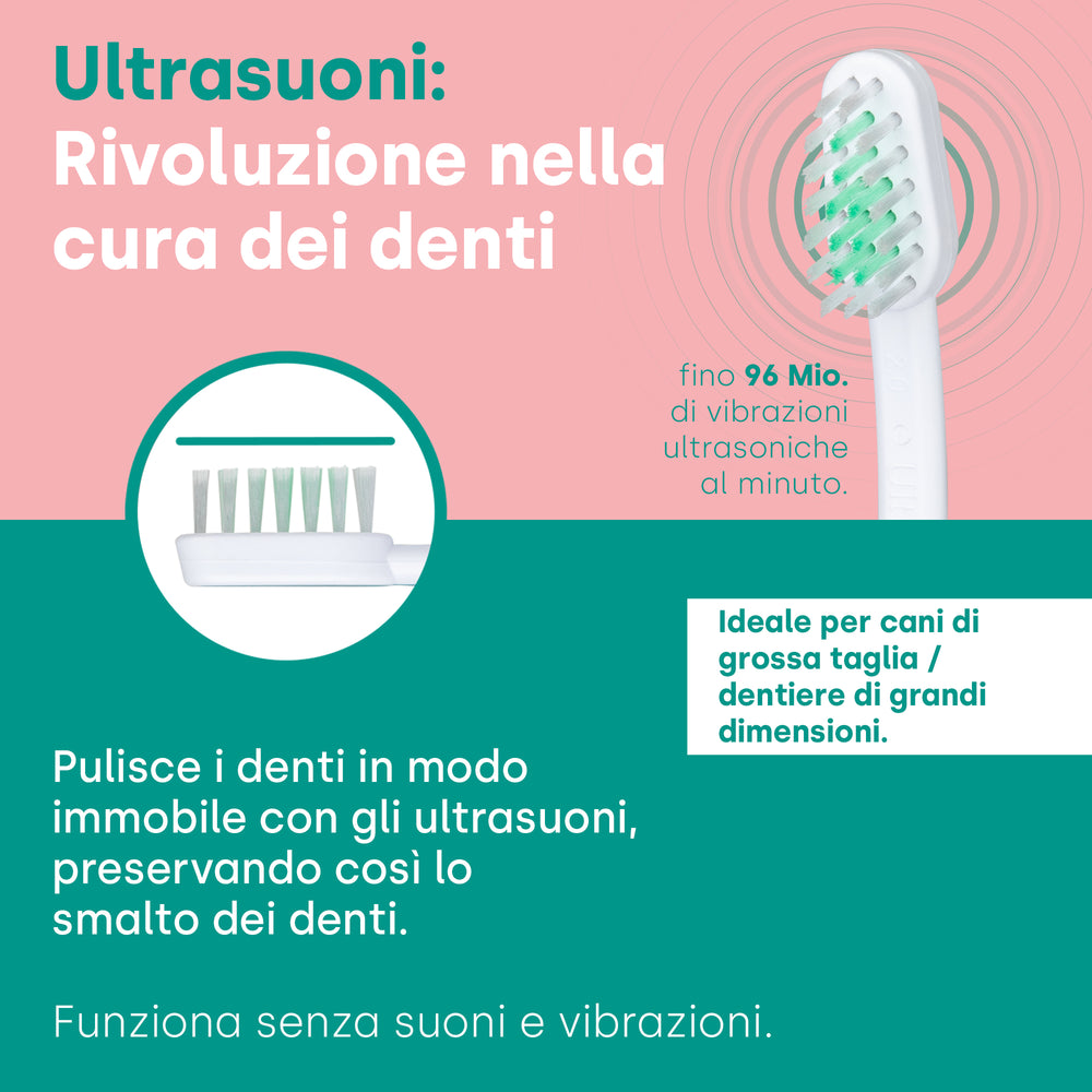 IL emmi-animale domestico La testina della spazzola ultrasonica sfrutta la tecnologia brevettata a ultrasuoni per raggiungere anche le aree difficili da raggiungere, che le setole tradizionali hanno difficoltà a pulire. Grazie a questa tecnologia rivoluzionaria, la placca e le impurità vengono rimosse in modo delicato ed efficace, favorendo la salute dentale del tuo animale domestico e prevenendo possibili malattie.