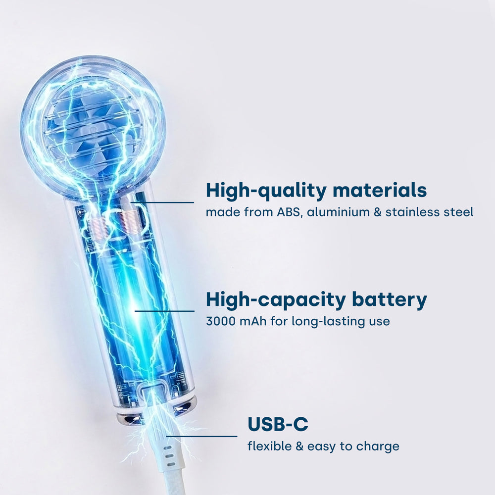 Grazie al suo design compatto e al peso ridotto, il ventilatore portatile si adatta a qualsiasi borsa ed è sempre a portata di mano quando hai bisogno di un rapido rinfresco. La combinazione di una potente batteria, una lavorazione di alta qualità e una tecnologia moderna lo rende la soluzione perfetta per le temperature calde.