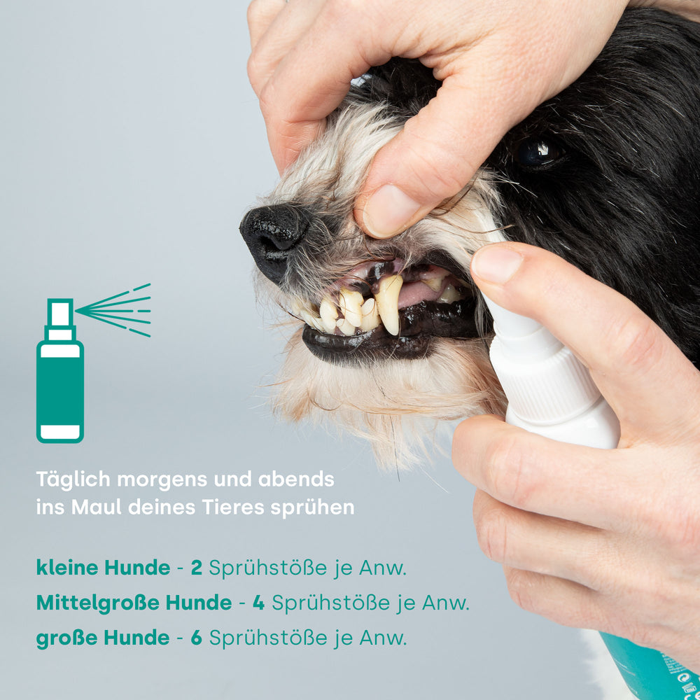• Täglich morgens und abends ins Maul Deines Tieres sprühen