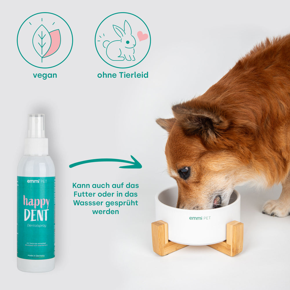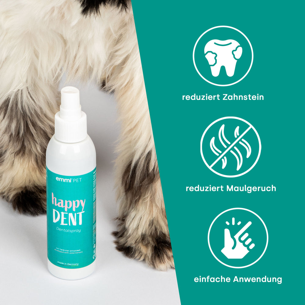 Das Happy DENT Dentalspray ist die ideale Lösung für frischen Atem und beugt Zahnstein effektiv vor. Einfach anzuwenden, bekämpft es Bakterien und Plaque, die Karies und Zahnfleischprobleme verursachen können. Ob im Büro, im Auto oder auf Reisen, mit dem Happy DENT Dentalspray hast du immer eine schnelle und praktische Lösung für die Mundhygiene deines Vierbeiners parat.