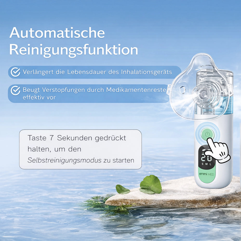 Mit 3 individuell einstellbaren Geschwindigkeitsstufen passt sich das emmi Inhalationsgerät optimal an Ihre Bedürfnisse an. Die integrierte Trockenprüfung schützt das Gerät vor Schäden, während die automatische Reinigungsfunktion für maximale Hygiene sorgt.