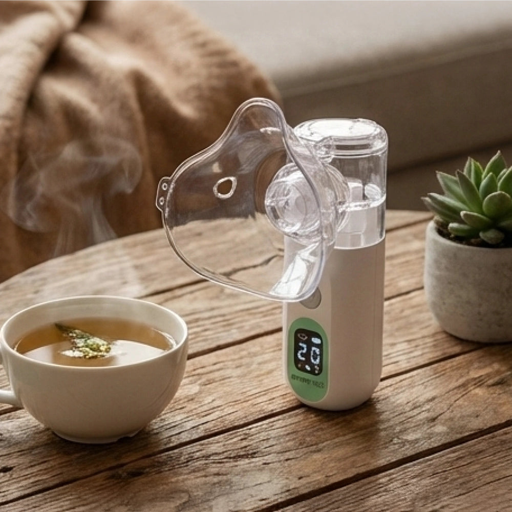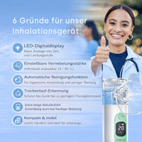 Das Inhalationsgerät ist kompakt, leicht (ca. 0,2 kg) und wiederaufladbar – perfekt für Zuhause, Reisen oder unterwegs. Das gut ablesbare Super-LCD-Display informiert übersichtlich über den Betriebsstatus.