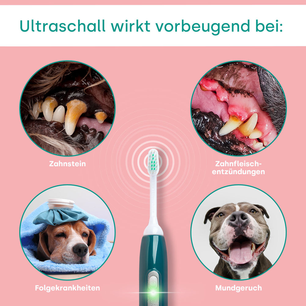 Anders als herkömmliche Bürsten, die auf mechanische Reinigung setzen, nutzt sie die sanfte Kraft des Ultraschalls, um Plaque und Bakterien zu entfernen bzw. reduzieren. Diese innovative Methode ist nicht nur effektiver bei der Vorbeugung von Zahnstein und Zahnfleischerkrankungen, sondern auch sanfter zum Zahnfleisch und den Zähnen deines Hundes. Das macht sie zu einer idealen Wahl für Hunde jeder Größe und jeden Alters, einschließlich empfindlicher oder älterer Tiere, bei denen eine schonende Pflege besonders wichtig ist.