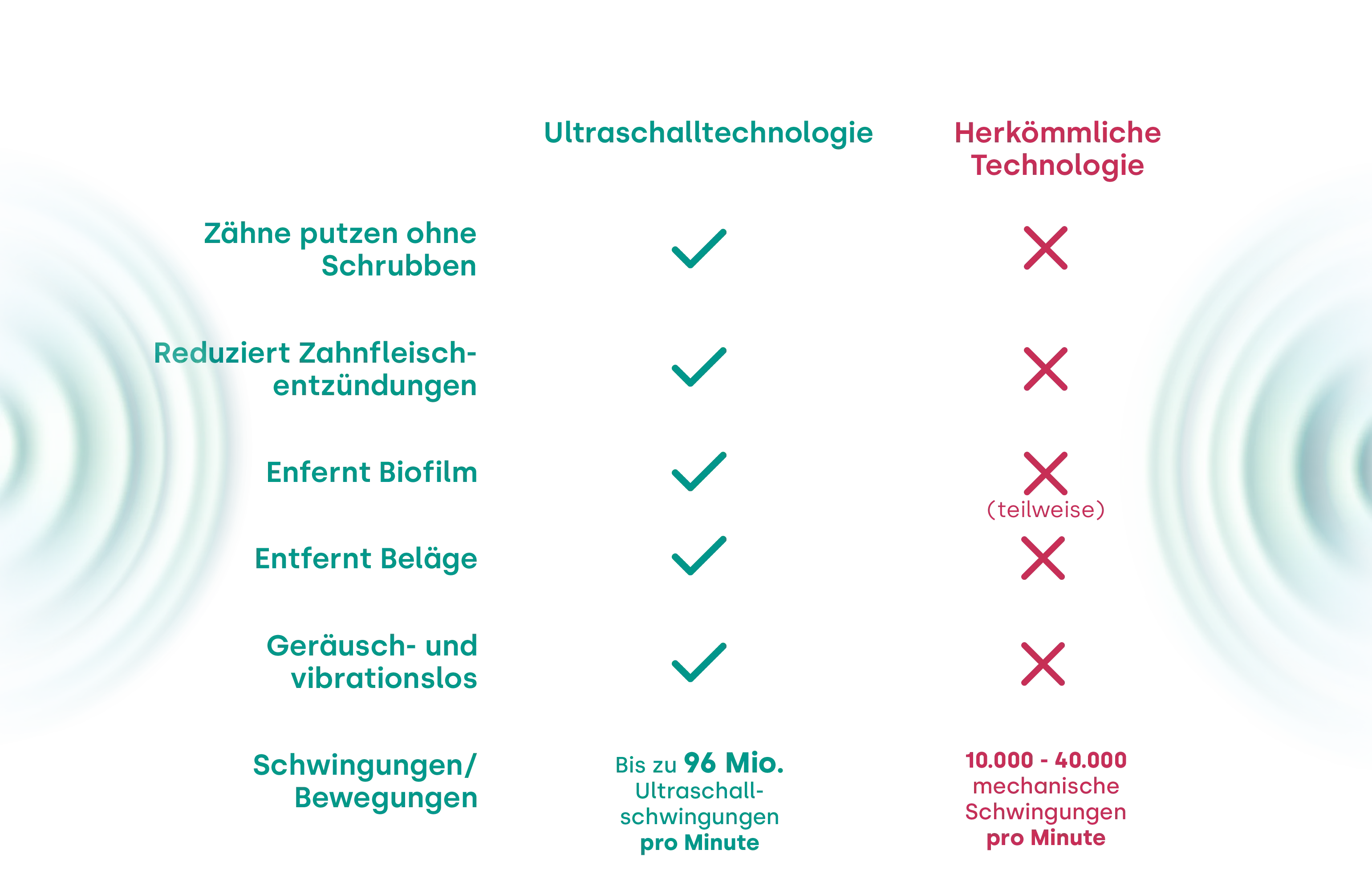 Zahnbürsten, die mit Ultraschall arbeiten, revolutionieren seit 2013 das Zähneputzen. Der entscheidende Vorteil gegenüber klassischen Handzahnbürsten oder elektrischen Zahnbürsten besteht darin, dass Ultraschallzahnbürsten fast berührungslos und ohne mechanischen Bewegungen funktionieren. Dadurch gestaltet sich die Reinigung besonders schonend und dennoch zuverlässig gründlich.