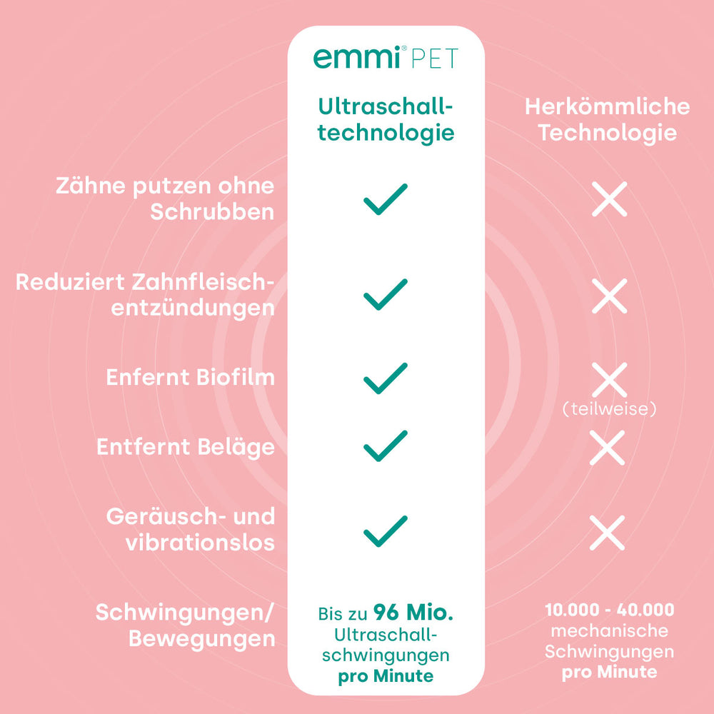 Die einzigartige Ultraschall-Technologie der emmi-pet 2.0, mit bis zu96 Millionen Ultraschallschwingungen pro Minute, bietet einen bedeutenden Vorteil gegenüber herkömmlichen Zahnreinigungsmethoden. Diese technologische Innovation ermöglicht es, Plaque sanft zu reduzieren und Zahnstein vorzubeugen und das Zahnfleisch sowie empfindliche Bereiche im Maul des Hundes zu schonen. Die Ultraschallwellen sind in dieser Frequenz für den Hund nicht hörbar, was die emmi-pet 2.0 besonders für Tiere geeignet macht.