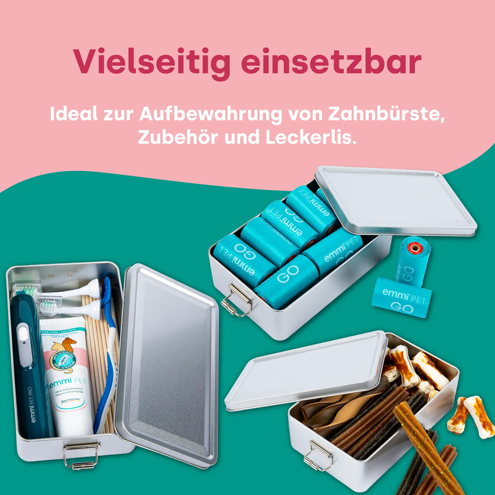Lefzenhalter oder Fingerlinge – in der robusten Dose bleibt dein gesamtes Zahnpflege-Zubehör hygienisch geschützt, ordentlich sortiert und jederzeit griffbereit. So hast du