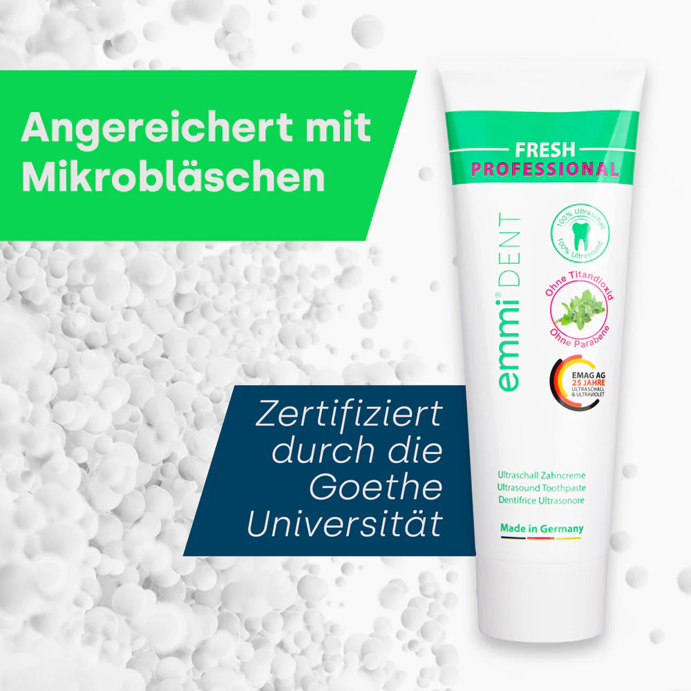 Die emmi-dent Fresh Zahnpasta ist ideal für empfindliche Zähne. Sie reinigt sanft, stärkt das Zahnfleisch und bekämpft Plaque und Zahnstein. Mit natürlichen Inhaltsstoffen sorgt sie für frischen Atem und ein sauberes Gefühl durch die revolutionäre Ultraschalltechnologie.
