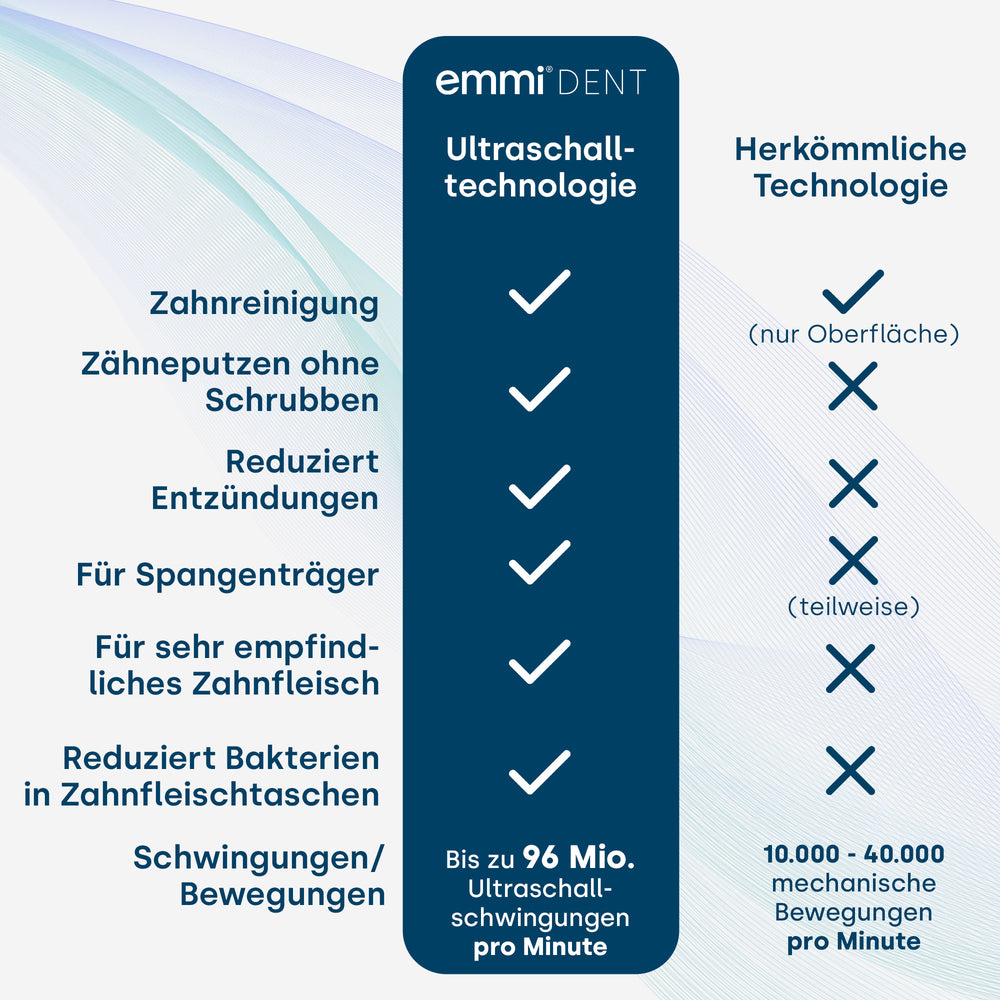 - Modernste Ultraschalltechnologie: Die emmi-dent Slim arbeitet mit bis zu 96 Millionen Multifrequenz-Schwingungen pro Minute. Plaque und Bakterien werden tiefenwirksam reduziert, auch an schwer erreichbaren Stellen.